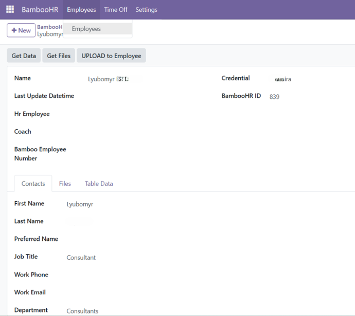 Отримати в Odoo дані по співробітниках з усіма заповненими полями і таблицями. Якщо відкрити конкретного співробітника, можна перейти на вкладку Table Data та натиснувши кнопку Get Data, ви отримаєте дані по таблицях з кабінету BambooHR. Через звичайний пошук можна знайти таблицю, яка вас цікавить.