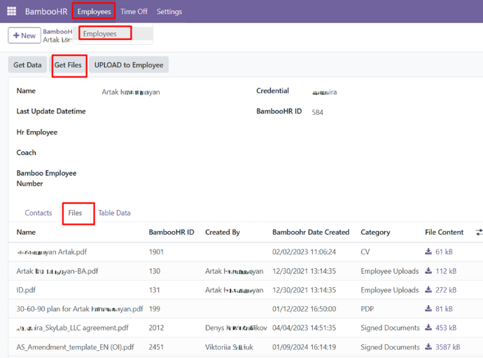 Імпорт файлів з кабінету BambooHR. Натисність в картці співробітника кнопку Get Files. Файли завантажаться у вкладці Files і їх можна скачати на комп’ютер.