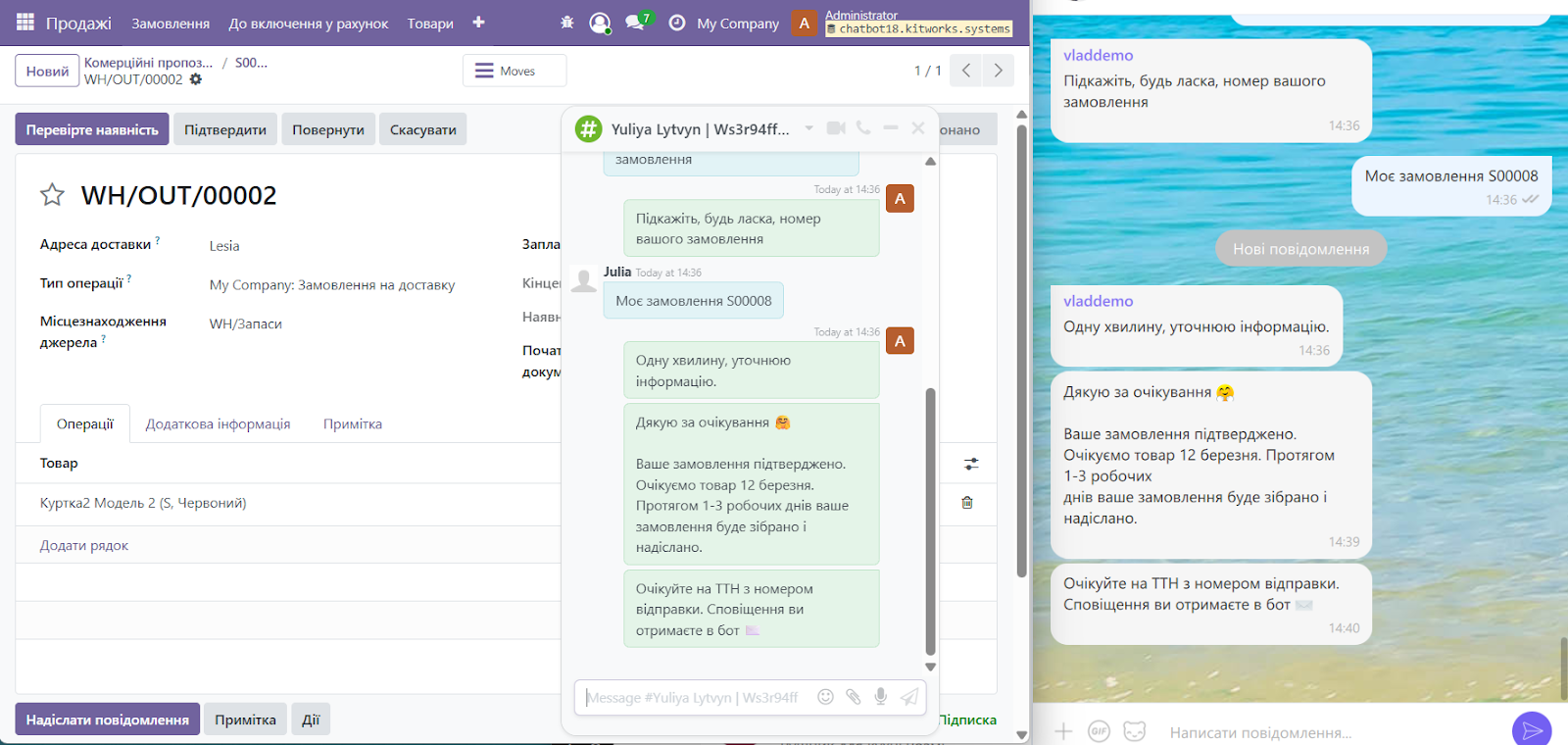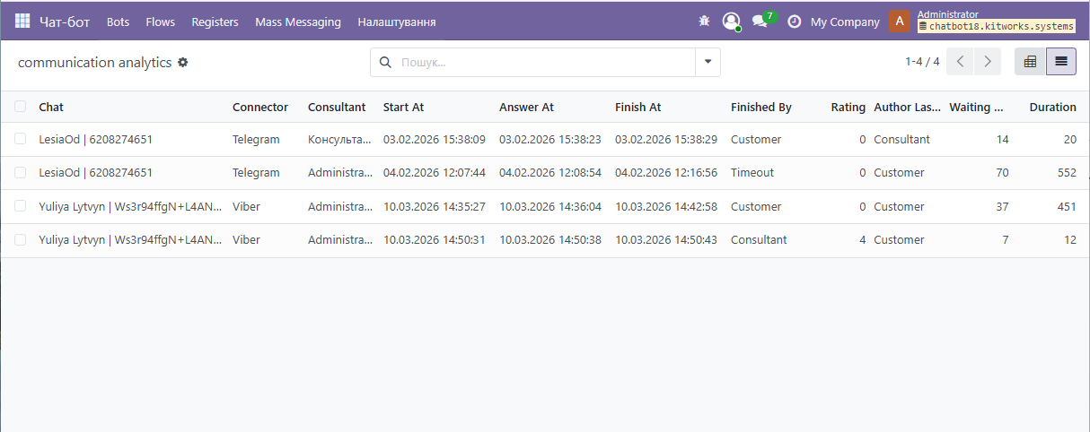 Після підписки клієнта на бота компанія може вести повноцінну двосторонню комунікацію: клієнт звертається через Viber, а оператор відповідає безпосередньо з Odoo.