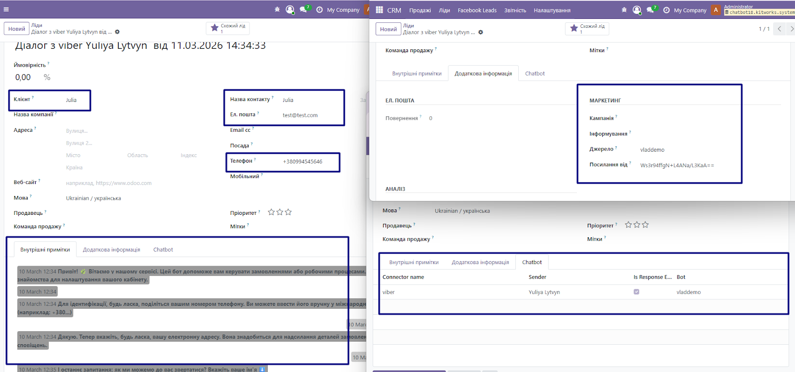 - Синхронізація контактів: Модуль автоматично ідентифікує клієнта та підтягує всю інформацію з картки контакту в лід.